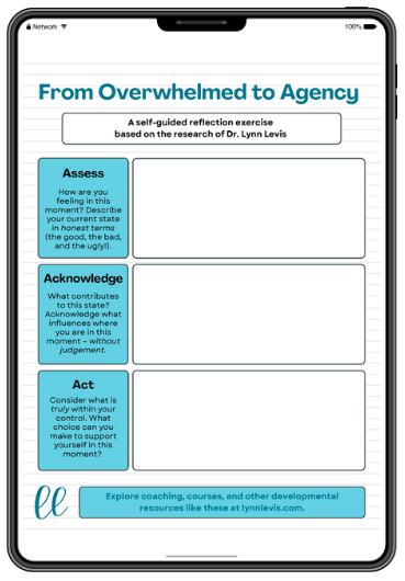 This is a free, self-guided reflection exercise grounded in my research on agency and sensemaking. Using a simple Assess–Acknowledge–Act framework, you’ll pause, name what’s shaping your current experience, and identify a choice that’s within your control. Designed to support clarity, self-compassion, and intentional action.